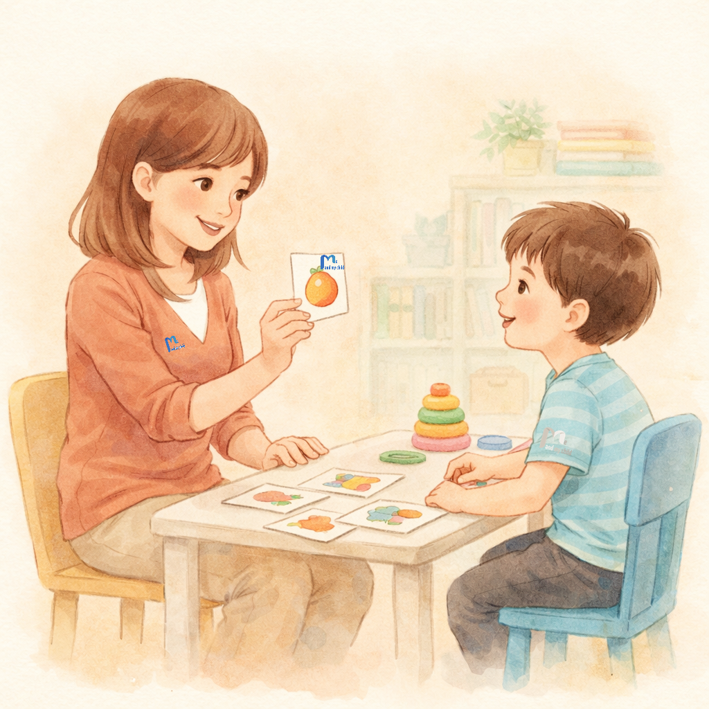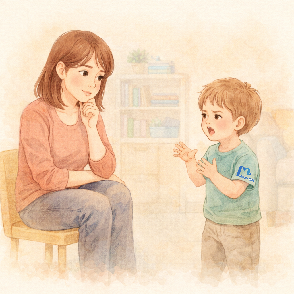 طفل يعاني من تأخر الكلام تجلس بجانبه والدته في مشهد داعم وهادئ