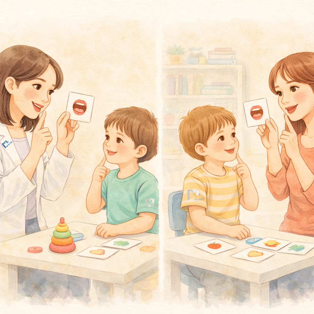 أخصائية لغة وتخاطب تساعد طفلًا على نطق الأصوات بشكل صحيح أثناء جلسة علاج